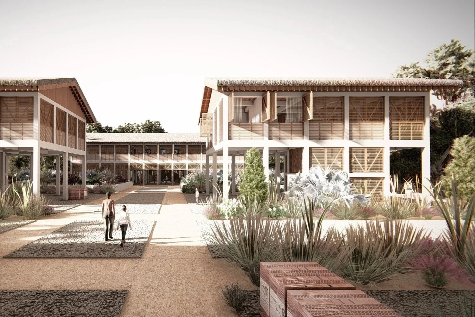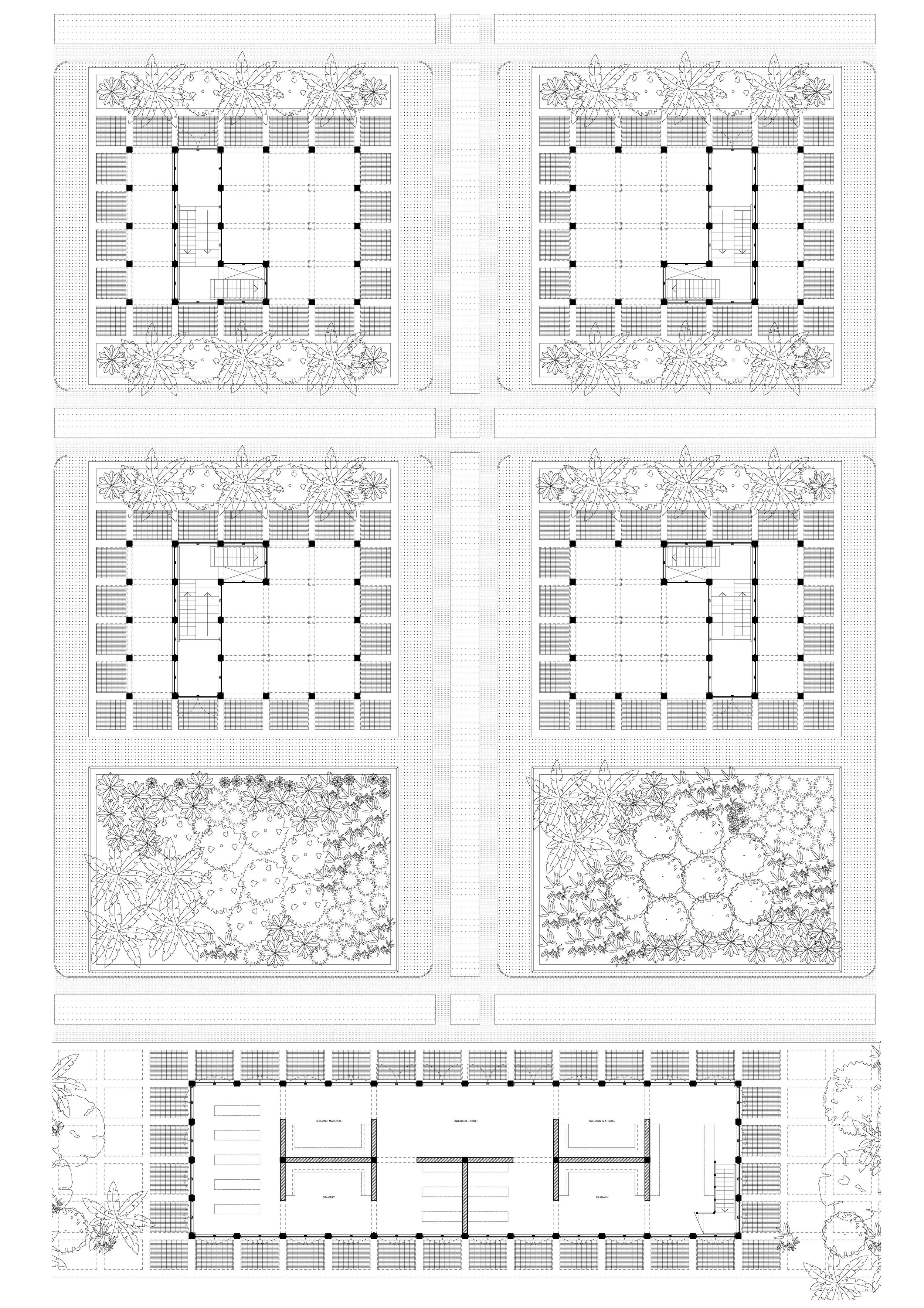 The house and the storehouse form a semi-closed system with the land. Foundations are burrowed deeply and are securely connected all the way up to the thatched roof forming one closed system. The structure then becomes a component of a flow-system strategy that is carefully designed to mitigate water levels during crisis events. There are 3 degrees of water depositories that help to do this; the bioswales, the permeable mixed pedestrian and vehicular zones and the flood gardens.